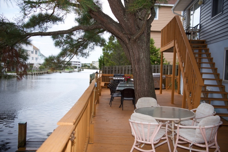There is a large back deck with a gas grill, four large dining tables, and comfortable chairs for a large family waterfront dinner. There are enough tables, benches, and chairs to seat 28 people for an outdoor dinner.
